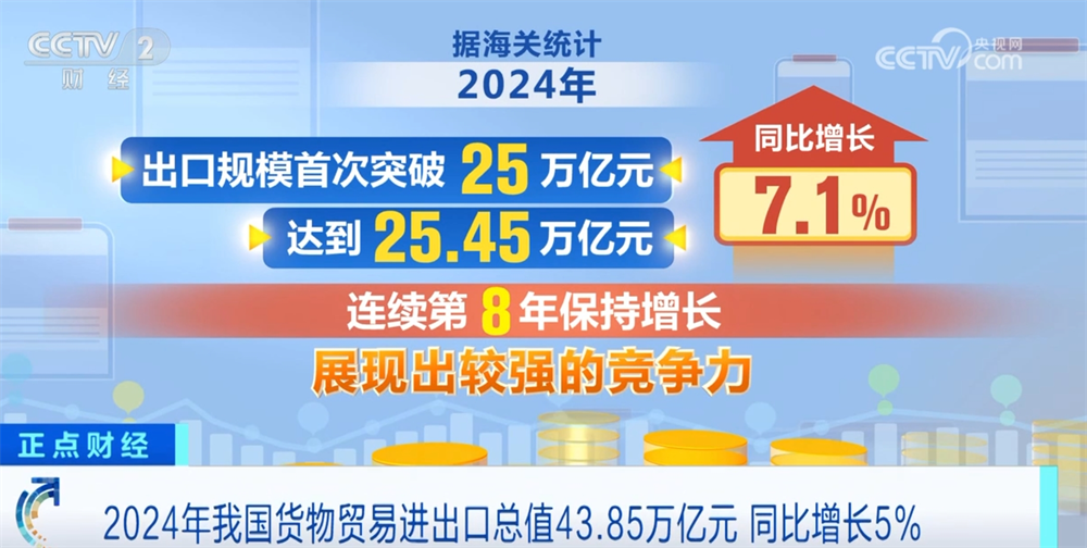 2024年,我国货色商业进出口总值43。85万亿元,同比增加5%。此中,出口规模达到25。45万亿元,同比增加7。1%,持续第8年连结增加。进口18。39万亿元,同比增加2。3%。43两个万亿级大关。从增量看,我国客岁外贸增加规模达到了2。1万亿元,相当于一个中等国度一年的外贸总量。目前看,我们的增速界次要经济体中也是较快的。”。